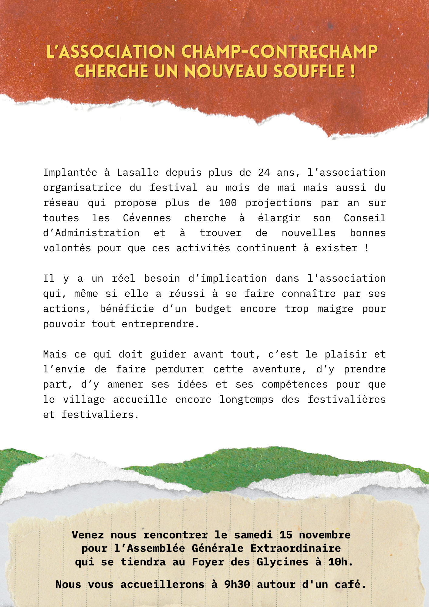 L’association CHAMP-CONTRECHAMP, créée en novembre 2001, s’est donné pour objectif d’organiser chaque année un festival de films documentaires sans palmarès à Lasalle, dans le Gard. Nous le voulons différent d’un festival conventionnel où l’on viendrait «consommer» des films.